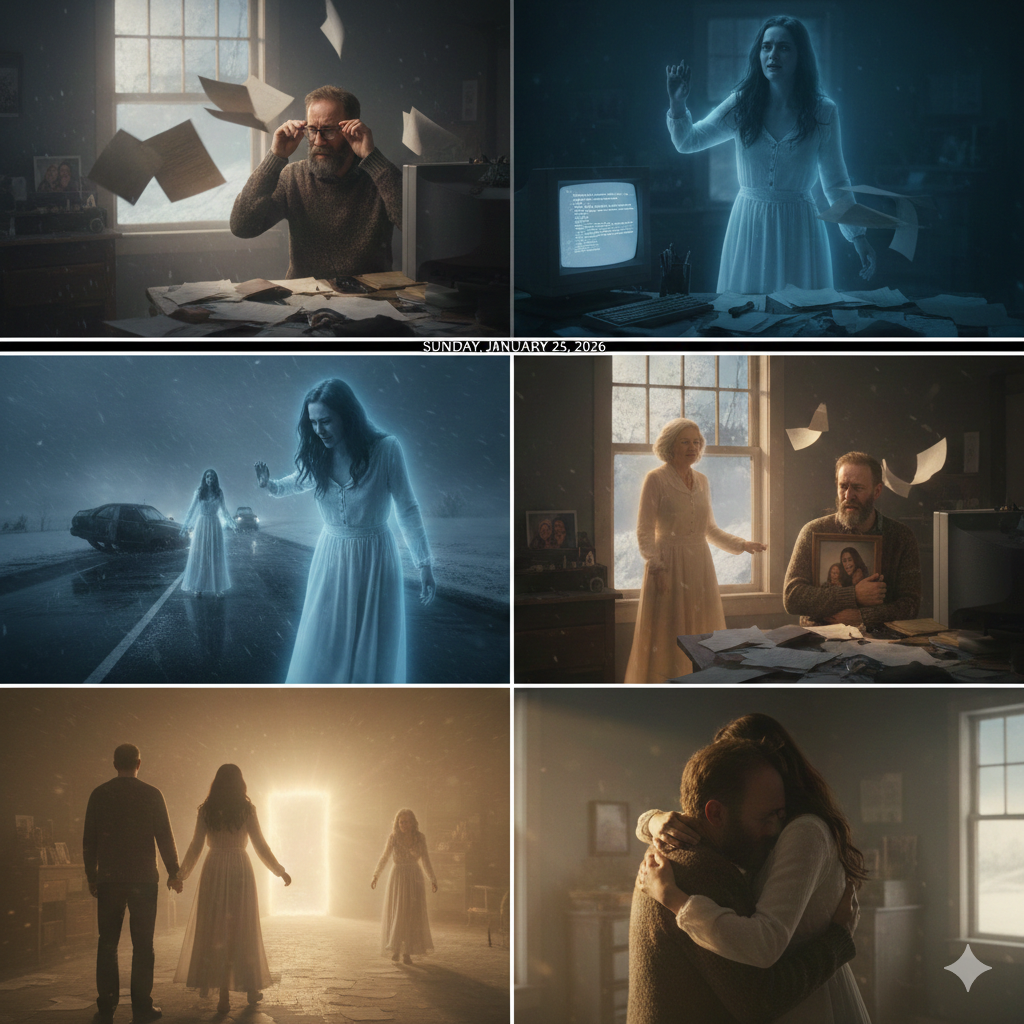 Late one night in his office, Henry breaks down. He opens a photograph of Brook on his computer and begins sobbing uncontrollably, apologizing to her memory for not being emotionally present, for making her feel second to his work. His grief is raw and unguarded. Brook, overwhelmed with remorse, begins to glow and partially solidify. For the first time, Henry sees her.
